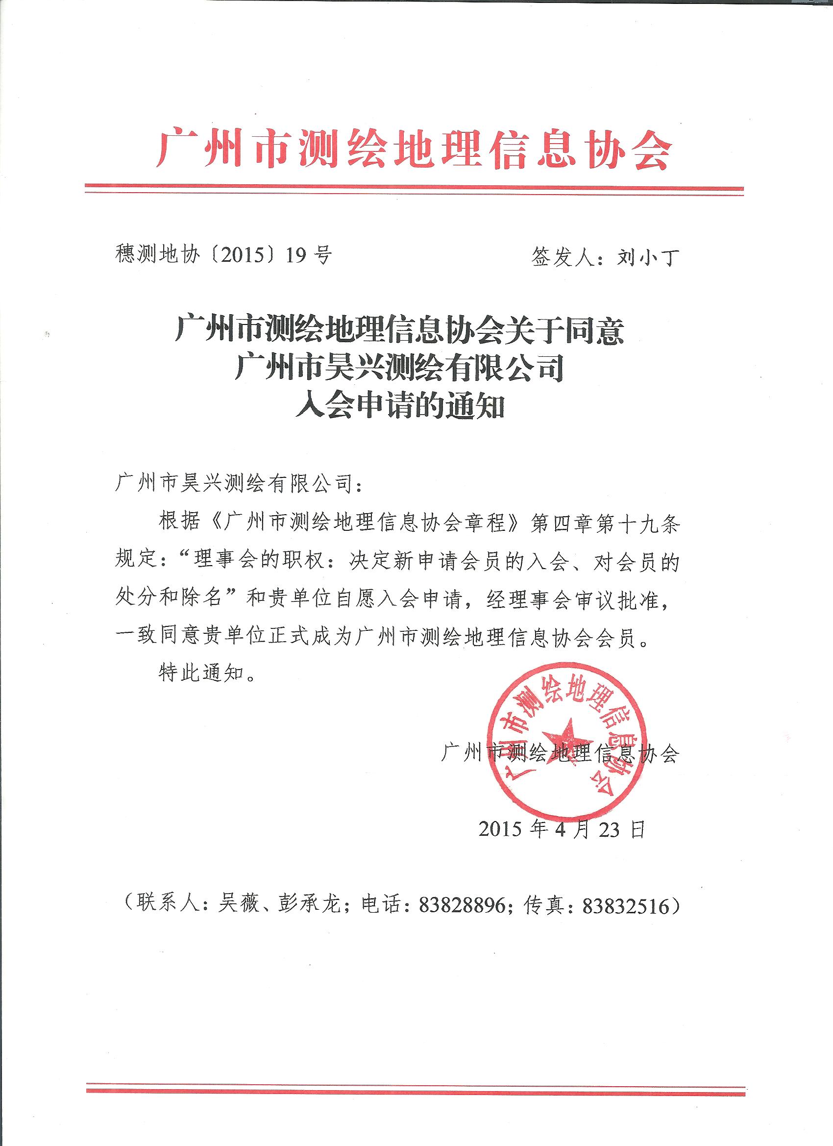 恭喜广州市昊兴测绘有限公司在2015423加入广州市测绘地理信息协会。